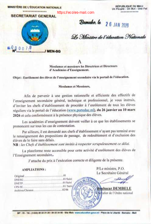 Afin de parvenir à une gestion rationnelle et efficiente des effectifs de l'enseignement secondaire général, technique et professionnel, je vous instruis, d'inviter les chefs d'établissement de procéder à l'enrôlement de tous les élèves réguliers via le portail de l'éducation (www.porteduc.ml), du 26 janvier au 10 mars 2026 et cela conformément à la présence physique des élèves.