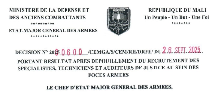 Le Chef d'Etat-major Général des Années informe les candidats retenus après le dépouillement des dossiers du recrutement des spécialistes, techniciens et auditeurs de justice au titre de l'année 2025, des spécialistes de !'Année de l'Air, de la Direction du Génie Militaire, de la Direction du Matériel, des Hydrocarbures et du Transport des Armées, de la Direction des Transmissions ,des Télécommunications et de !'Informatique des Armées, de la Direction Centrale du Service de Santé des Armées, de la Direction de l'Information et des Relations Publiques des Armées, de la Direction de la Justice Militaire et des Ateliers Militaires Centraux de Markala, que les résultats sont disponibles sur le site FAMa www.fama.ml. de la DIRPA.